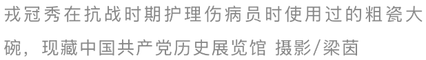 在中国共产党历史展览馆里,崇敬着一只直径18厘米的粗瓷大碗,这是戎冠秀在抗日战争时间顾问伤病员时也曾使用过的。