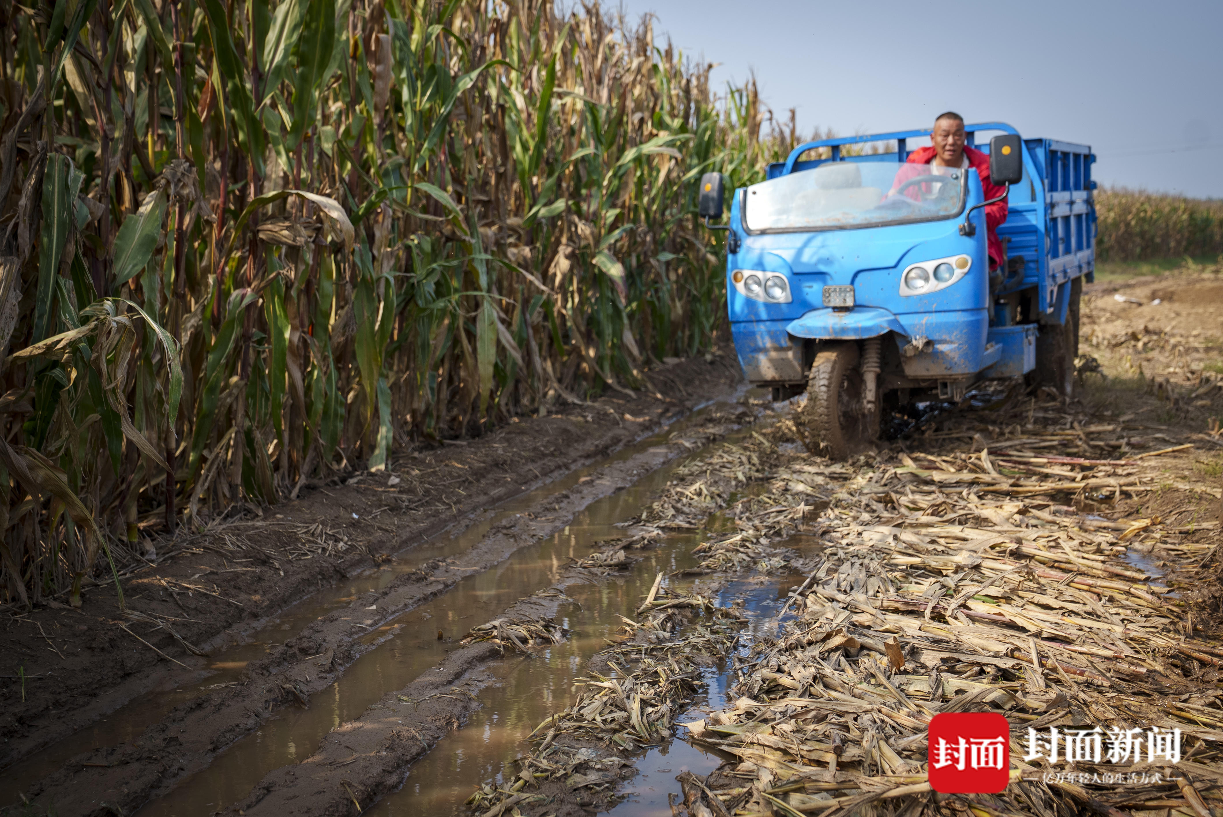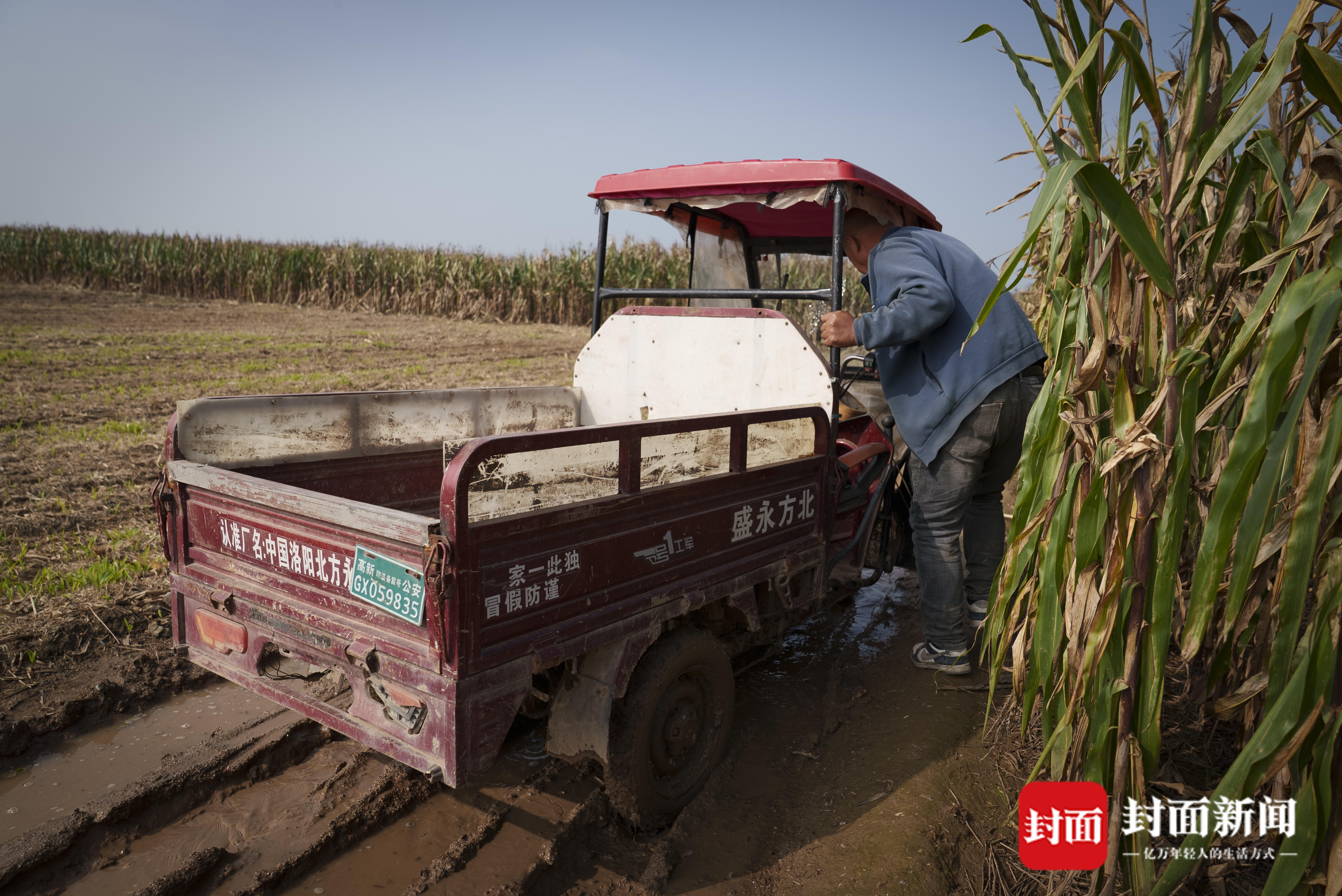 10月14日,河南焦作市苏家作乡北石涧村莳植户李政年,在泥泞的中东说念主力收货莳植的9亩玉米。
