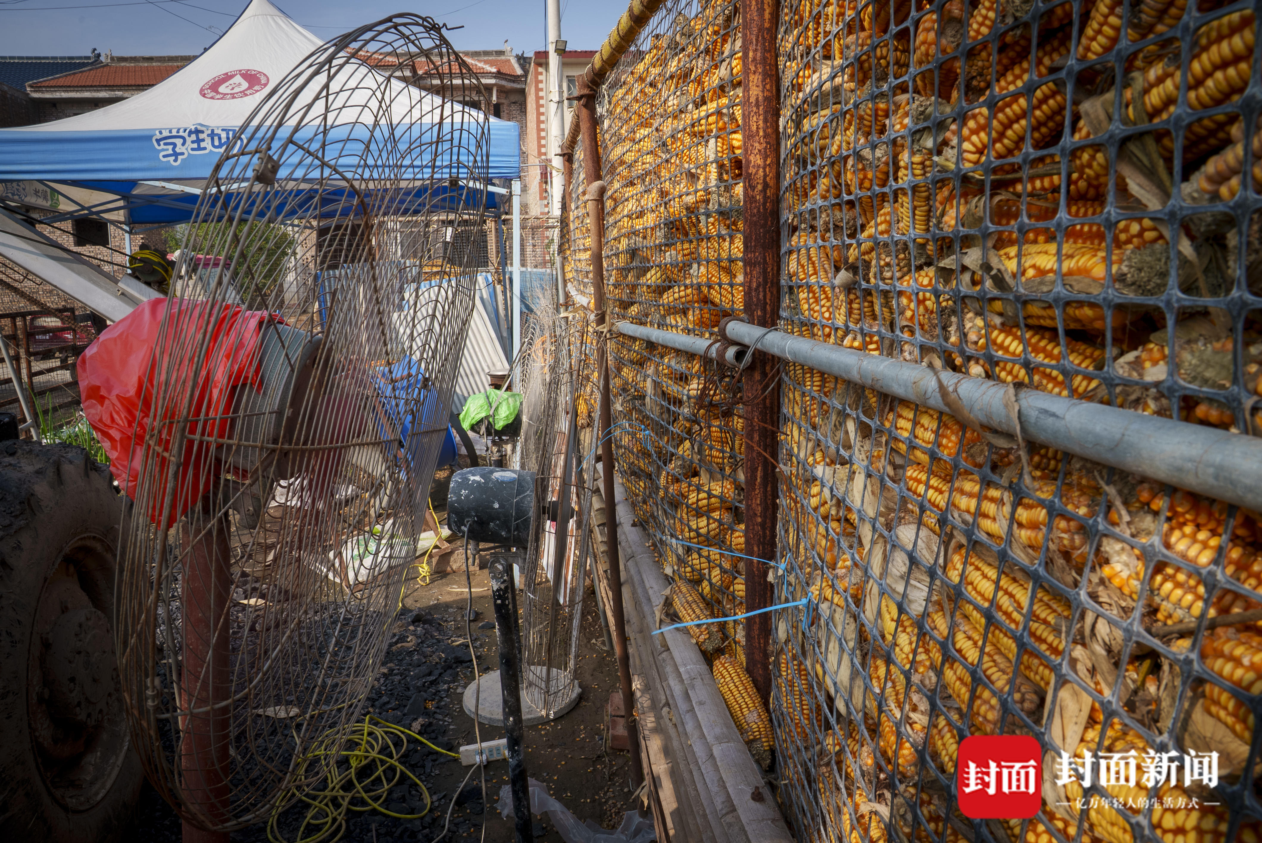 10月14日,河南焦作市苏家作乡北石涧村,莳植户用风扇为曝晒的玉米透风。莳植户周广山暗示,还是开了5、6天了,“但愿减慢玉米发霉、发芽。”