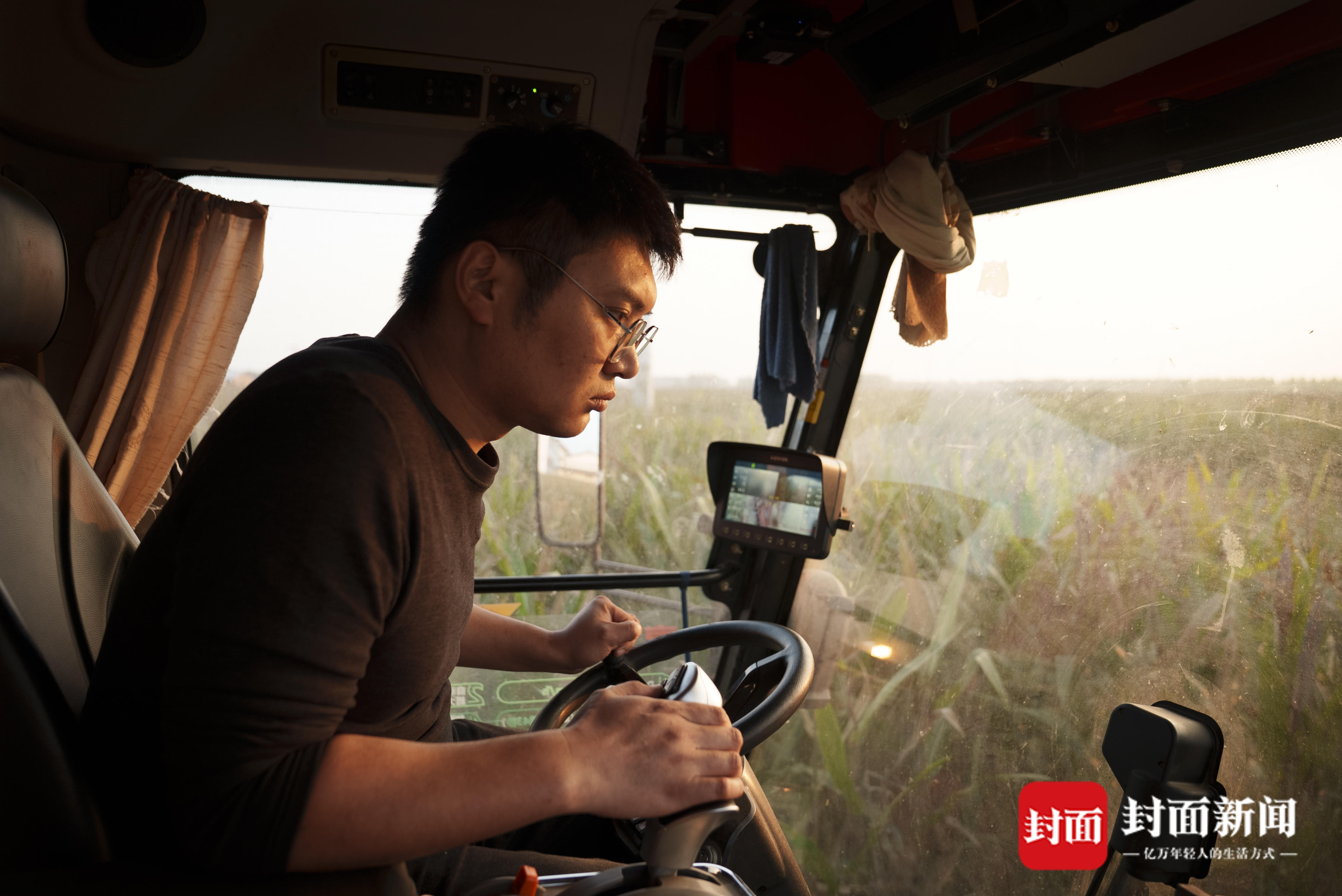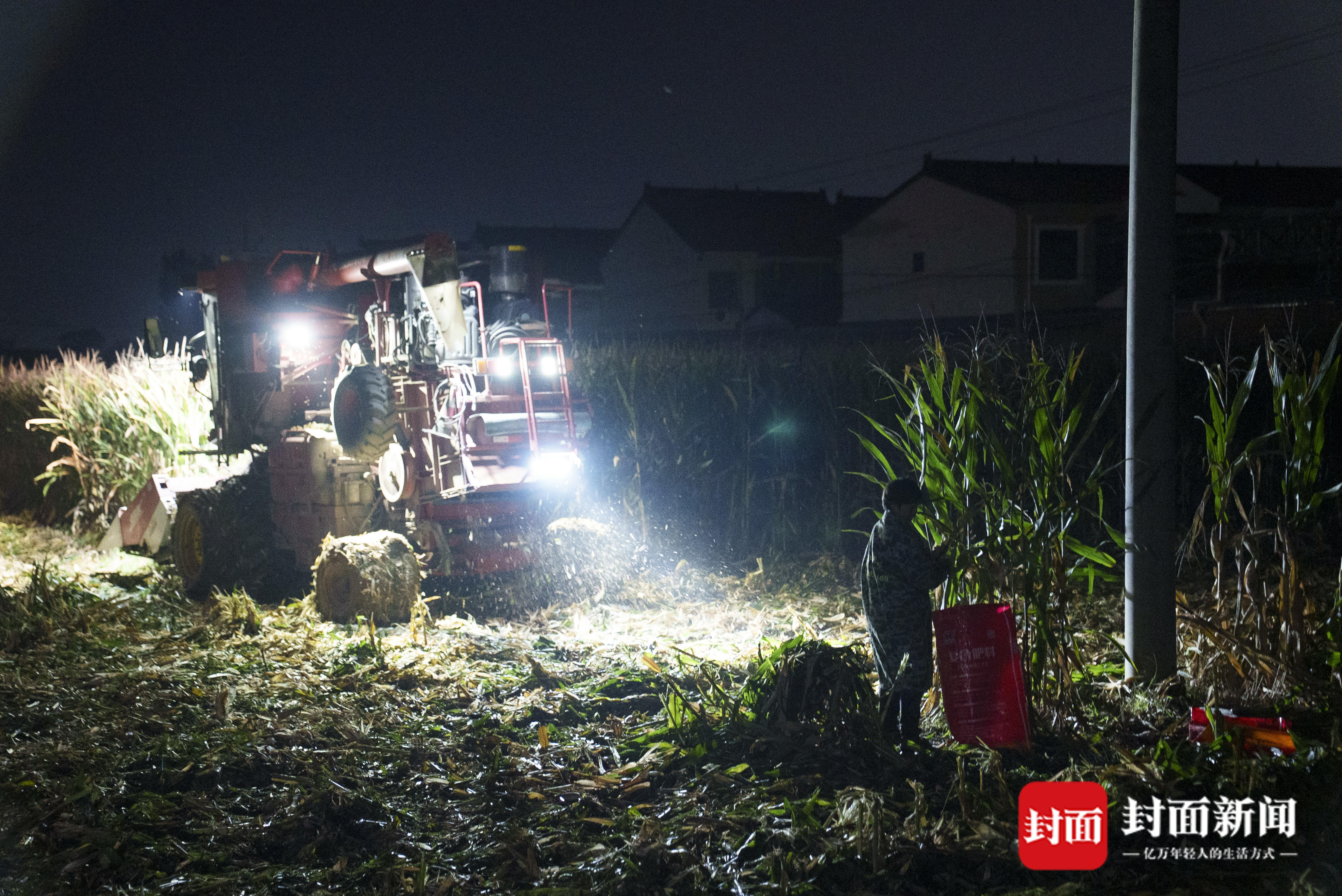10月13日晚,河南焦作市温县韩郭作村,赵东明驾驶收割机连夜抢收。他说当晚“干到11点多才收工。”